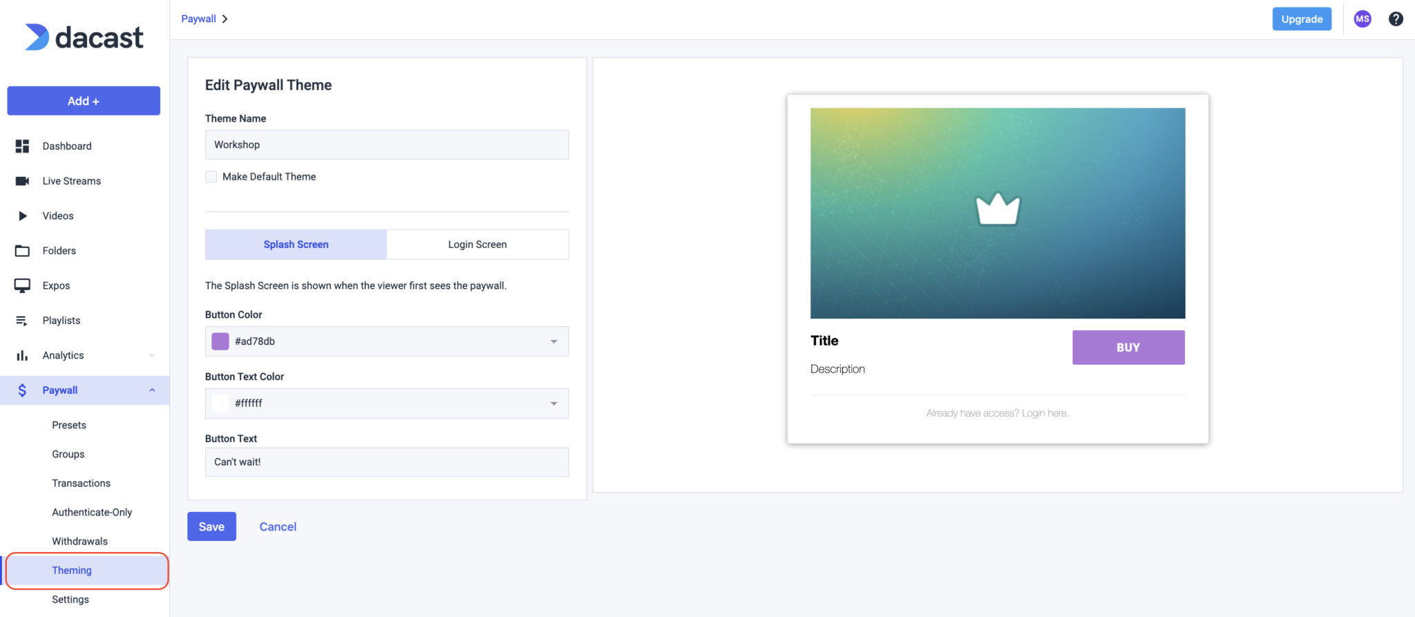 Under the “Paywall” section, select the “Theming” tab. Once you’re there, you will find a list of all your themes. You can create a new theme or edit an existing one. To create a new theme, click on “New Paywall Theme” in the top right corner. Within the Splash Screen tab, you can change the button color and the button text color: