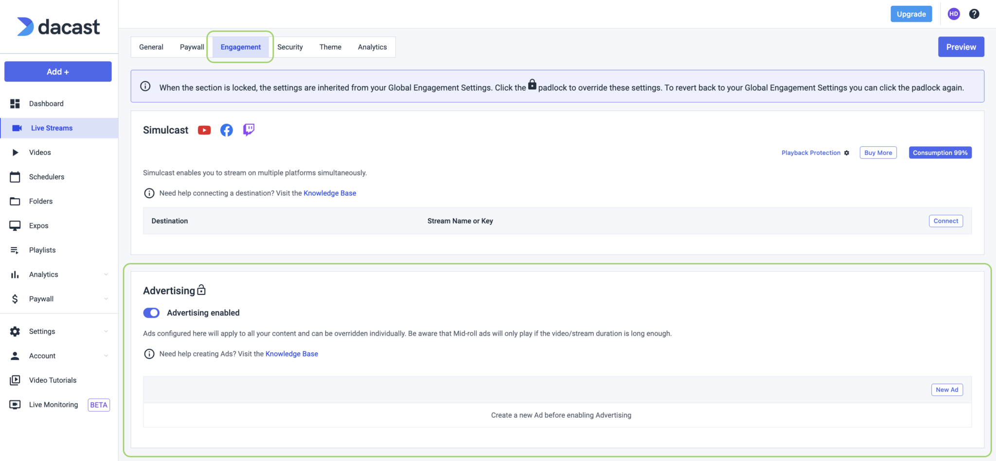 You can integrate a wide variety of ad servers and ad networks directly with your Dacast video player. Simply use your server or ad network account credentials and set this up in your Dacast account